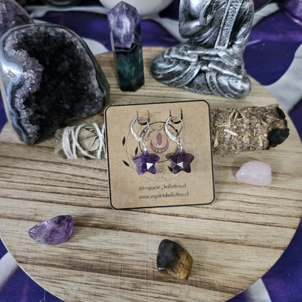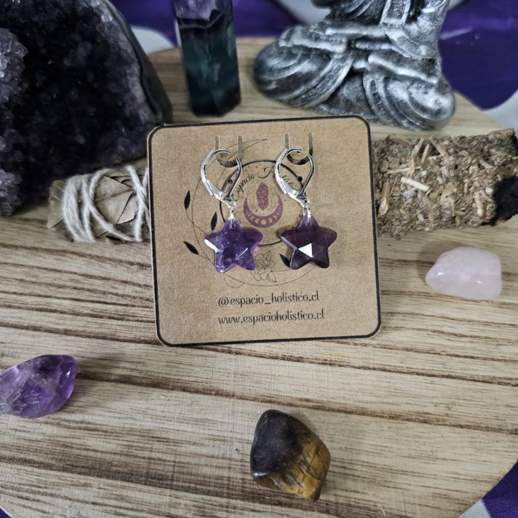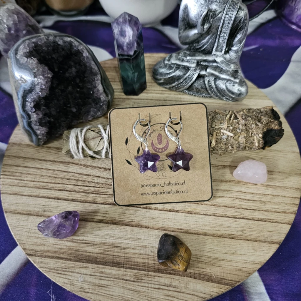 Estos deslumbrantes aros destacan la mágica energía de la Amatista, tallada en forma de estrella, un símbolo de guía, equilibrio y conexión con el universo.