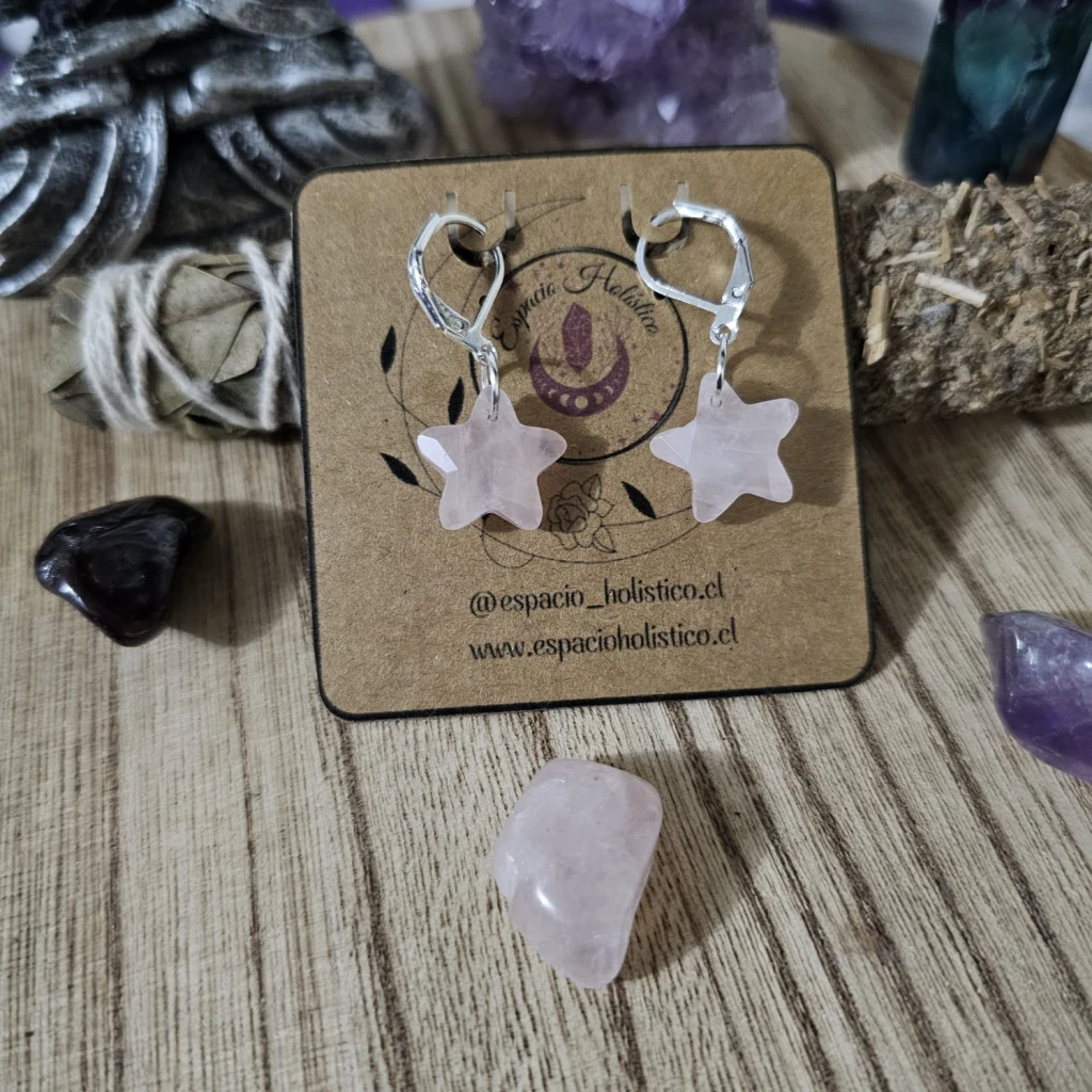 Aros Protectores Ritualizados de Cuarzo Rosa en Forma de Estrella con Gancho Baño de Plata 925