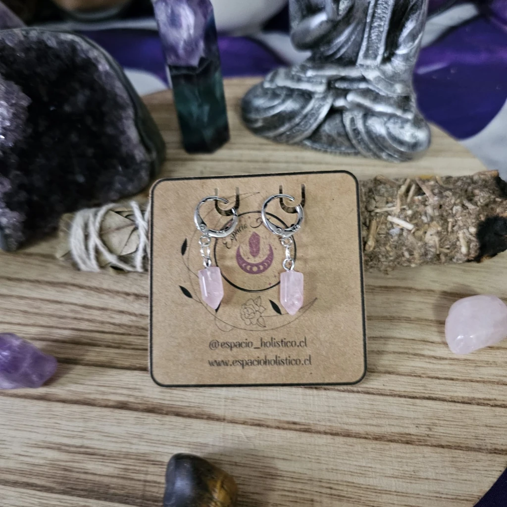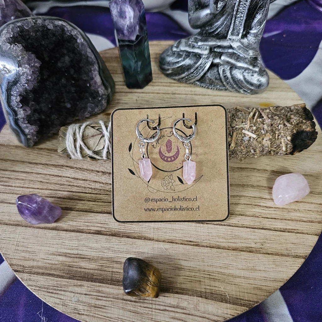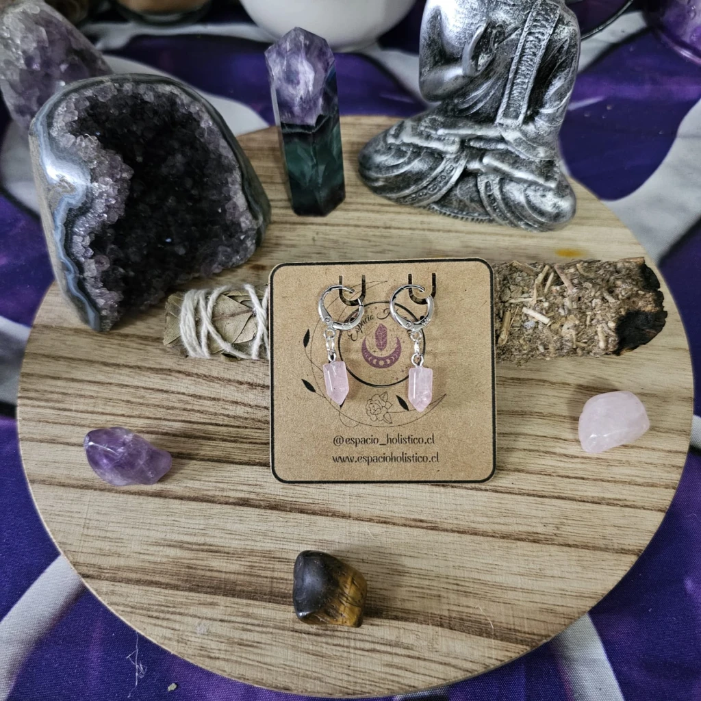 Conecta con la dulzura y la energía sanadora del Cuarzo Rosa a través de estos delicados aros en punta, acompañados de ganchos baño de plata. Una joya llena de ternura y poder, ideal para quienes desean portar un amuleto que inspire amor propio, calma y armonía emocional.