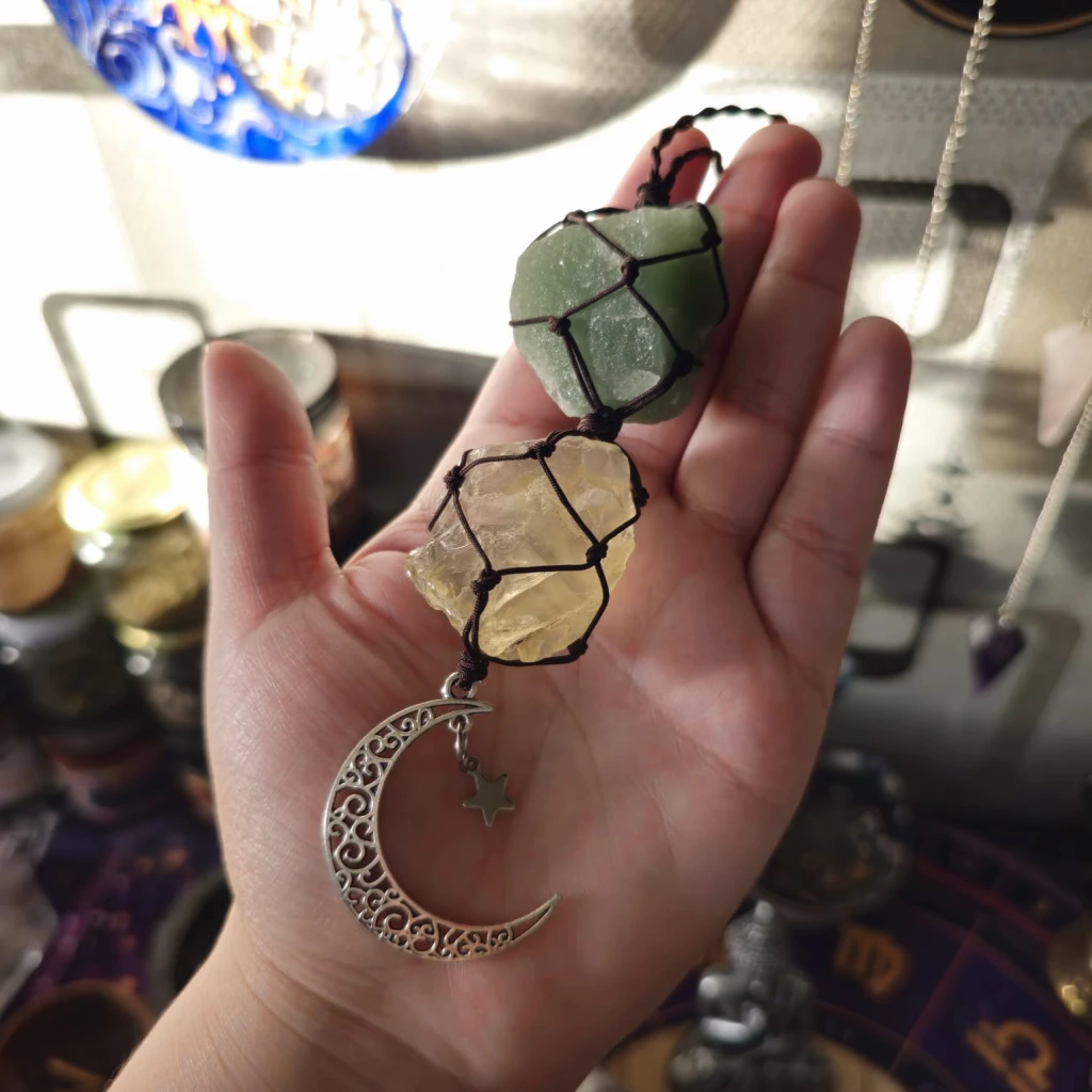 Este hermoso colgante combina las propiedades energéticas de la Aventurina y el Citrino, conocidas por su capacidad para atraer prosperidad, éxito y buena fortuna. Incluye un dije grande en forma de media luna con estrella, que simboliza la conexión entre lo terrenal y lo divino.
