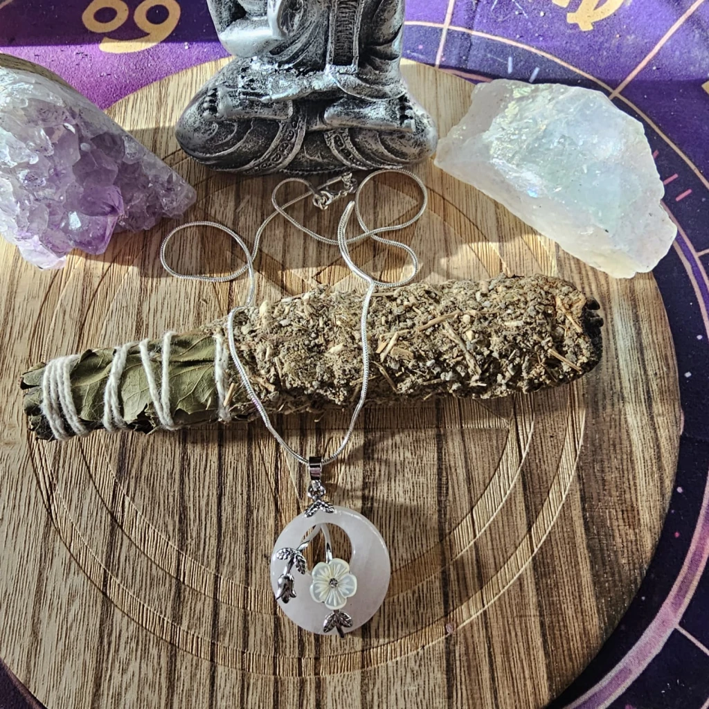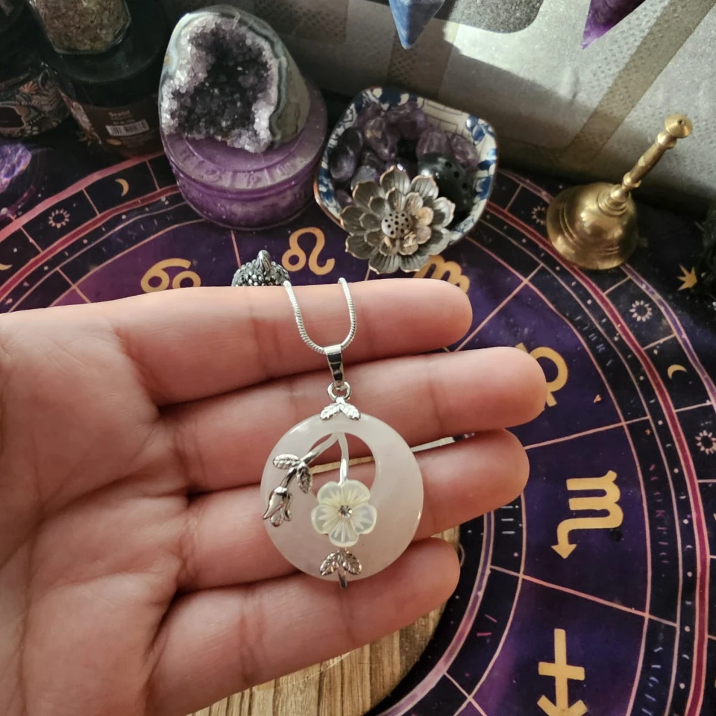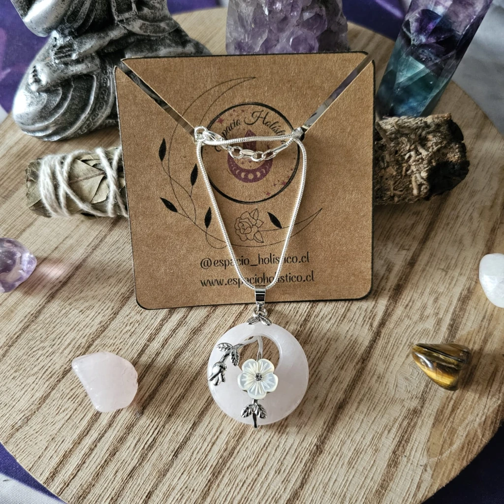 Este hermoso collar combina la poderosa energía del Cuarzo Rosa, tallada en forma de círculo, un símbolo milenario que representa la protección, la unidad y el flujo eterno de la energía. Desde tiempos ancestrales, el círculo ha sido considerado una figura sagrada, sin principio ni fin, que simboliza la perfección, la totalidad y el equilibrio.