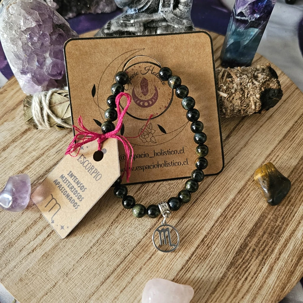 Esta pulsera ha sido creada pensando en la energía y esencia de Escorpio. Elaborada con una piedra natural que resuena con las características de este signo y acompañada con un dije que representa su glifo zodiacal como símbolo de identidad astrológica. Esta pulsera no es solo un accesorio, sino un poderoso amuleto de protección energética.