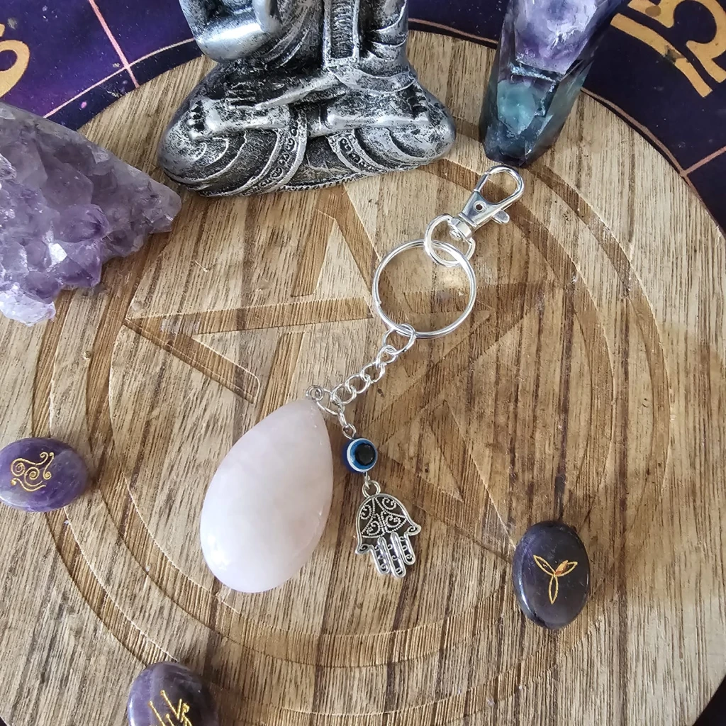 /Llavero Protector Ritualizado de Cuarzo Rosa con dije de Mano de Fátima y Ojo Turco