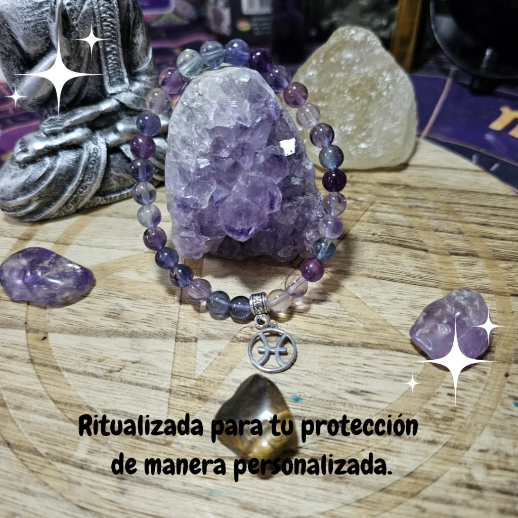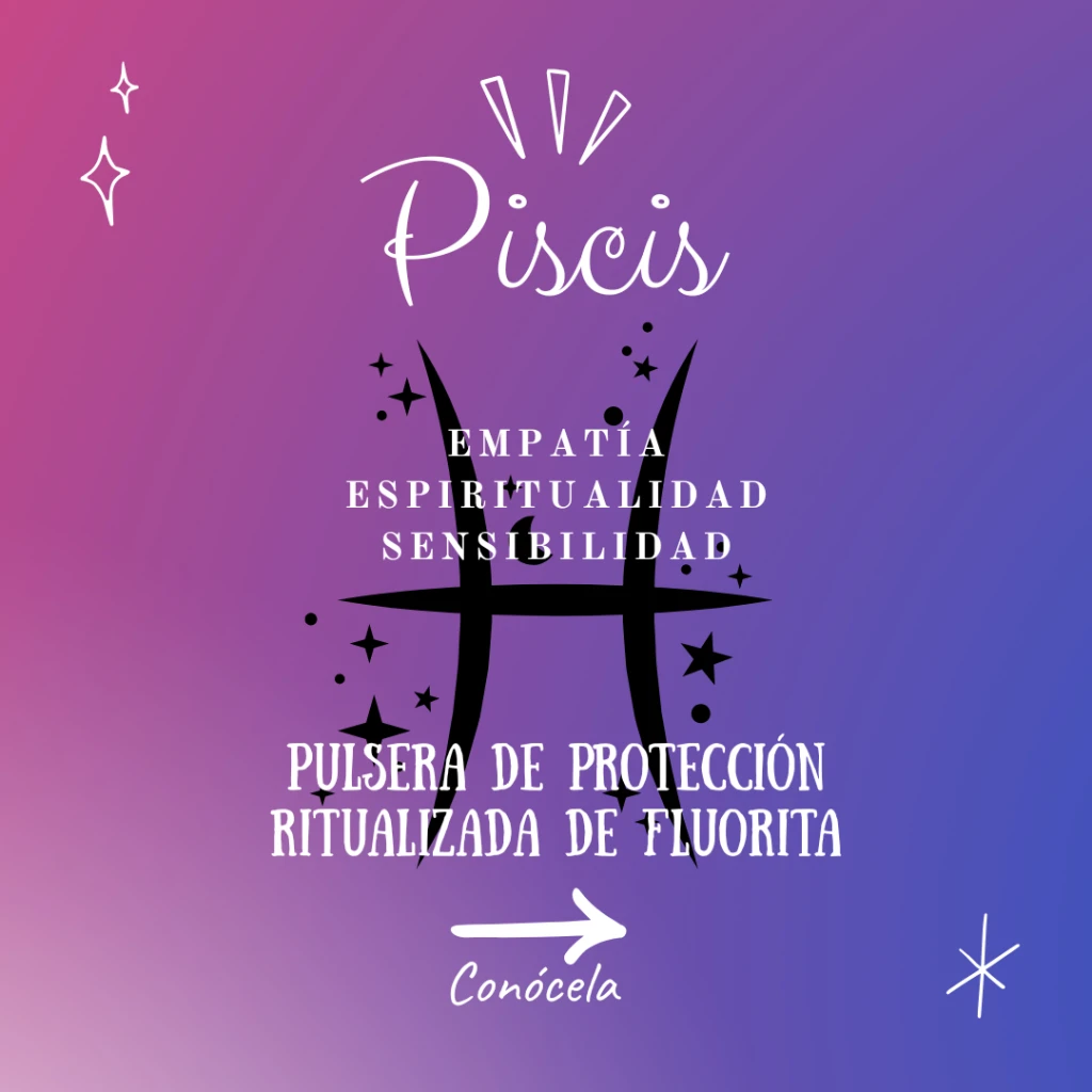 Esta pulsera ha sido creada pensando en la energía y esencia de Piscis. Elaborada con una piedra natural que resuena con las características de este signo y acompañada con un dije que representa su glifo zodiacal como símbolo de identidad astrológica. Esta pulsera no es solo un accesorio, sino un poderoso amuleto de protección energética.