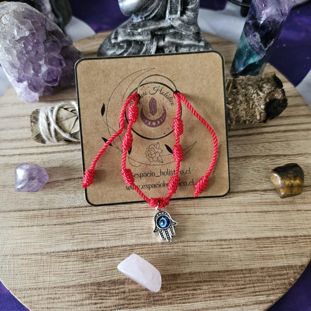 Acompañada con un dije de Mano de Fátima o Jamsa, un símbolo de fortuna, armonía y amor, esta pulsera aleja las malas vibras y atrae protección, El Ojo Turco o Nazar completa el amuleto como un antiguo guardián contra las envidias y energías no deseadas.