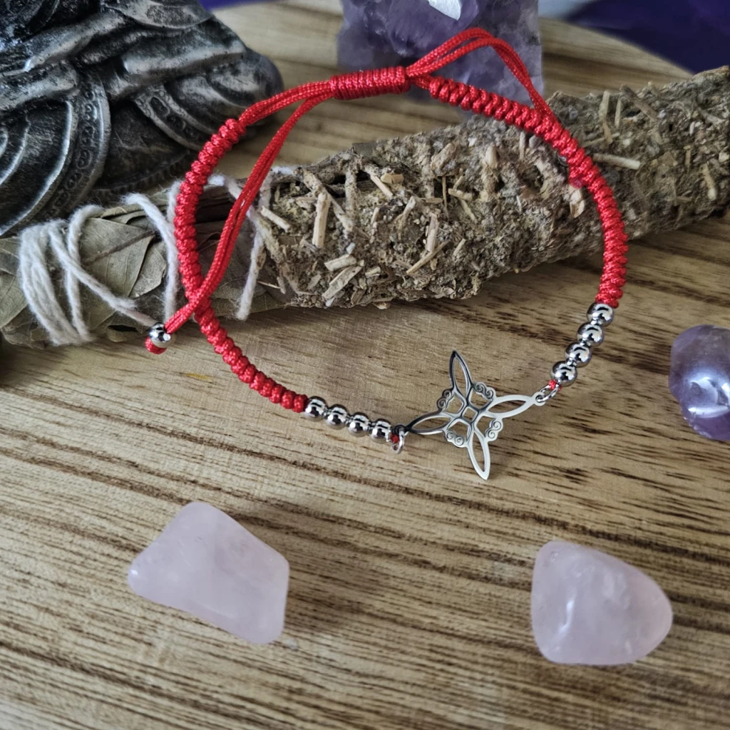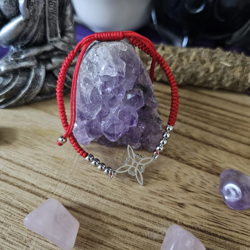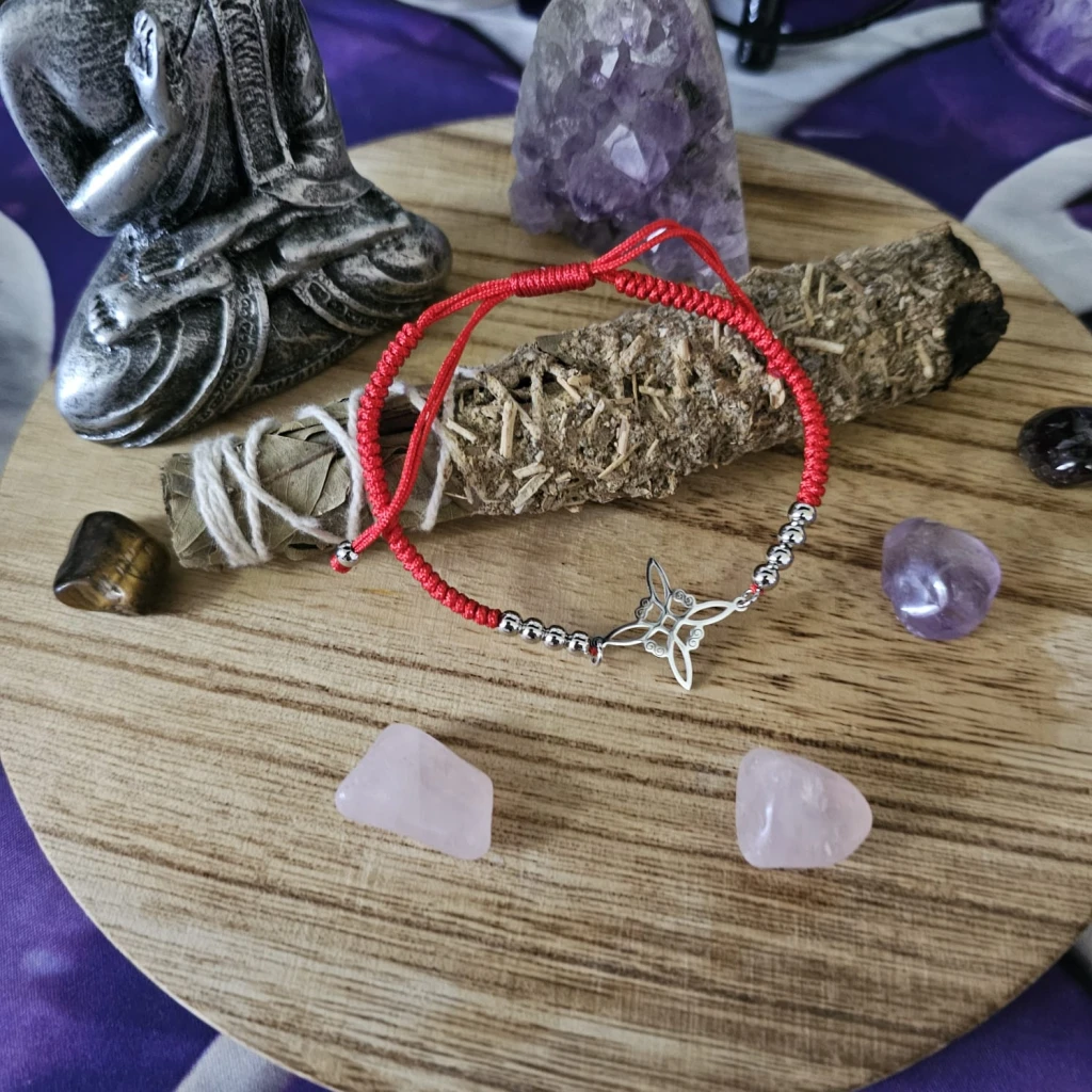 Esta poderosa pulsera tejida a mano con hilo rojo, símbolo ancestral de protección. El hilo rojo actúa como un escudo vibracional que repele el mal de ojo, la envidia y las energías densas que pudieran afectar tu bienestar.