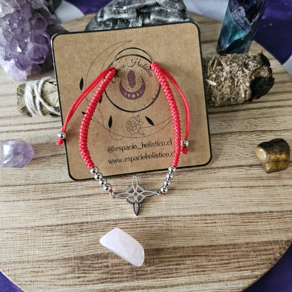 El centro de esta pulsera lo ocupa un dije de Nudo de Bruja en acero inoxidable, símbolo místico de poder y sabiduría ancestral. Este símbolo representa los cuatro elementos, la conexión con el todo y la capacidad de la bruja de tejer el destino con intención, claridad y propósito. Es un emblema de protección que refleja y devuelve cualquier energía malintencionada a su origen.