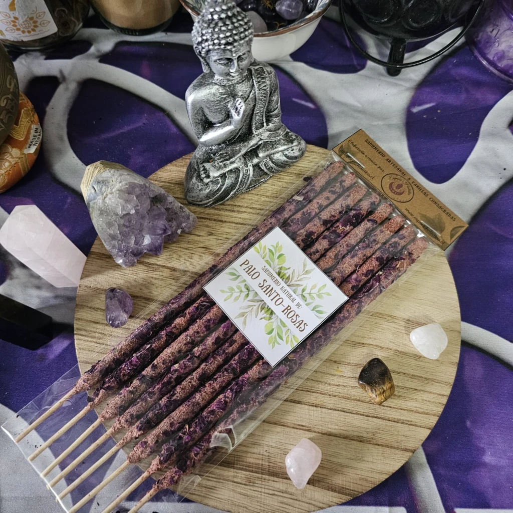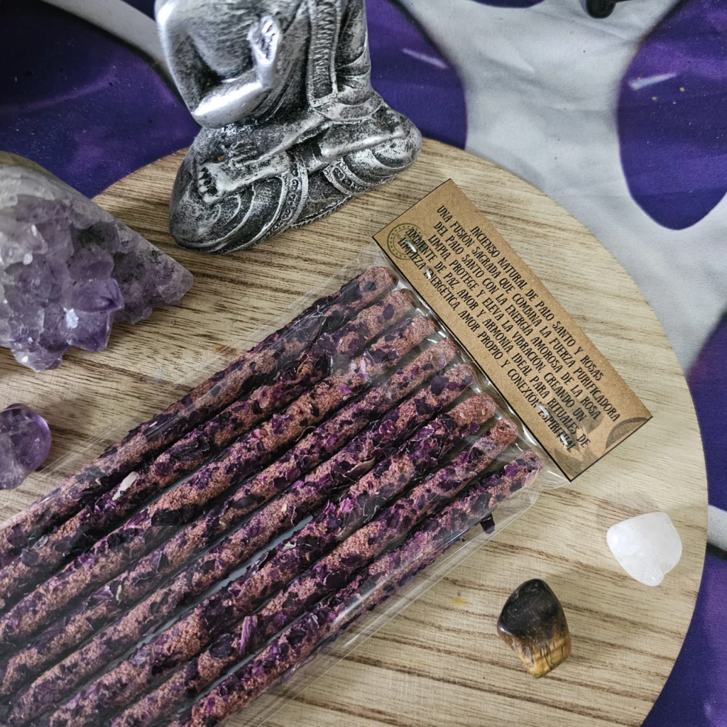 🌿 Propiedades: El Palo Santo es reconocido por su poder para purificar, limpiar energías negativas y atraer protección espiritual. Combinado con la Rosa, símbolo de amor, ternura y sanación emocional, genera un equilibrio perfecto entre fuerza protectora y dulzura amorosa, elevando la vibración del alma y del hogar.