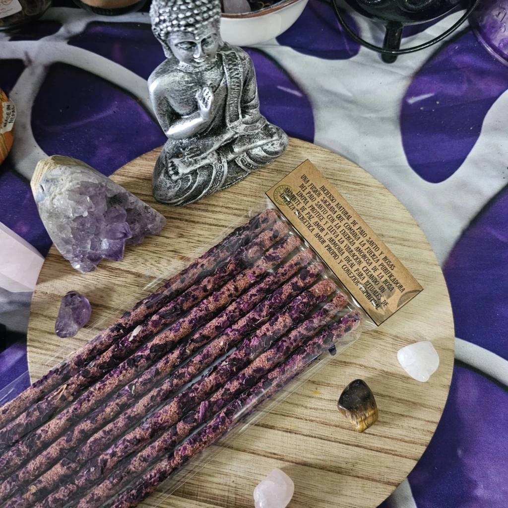 Consagrados mediante un ritual específico: Cada varilla de estos sahumerios es consagrada con amor, intención y dedicación. A través de técnicas ancestrales y magia ritualizada, se impregnan con vibraciones de amor, paz y limpieza energética, creando un ambiente de pureza y conexión con el corazón.